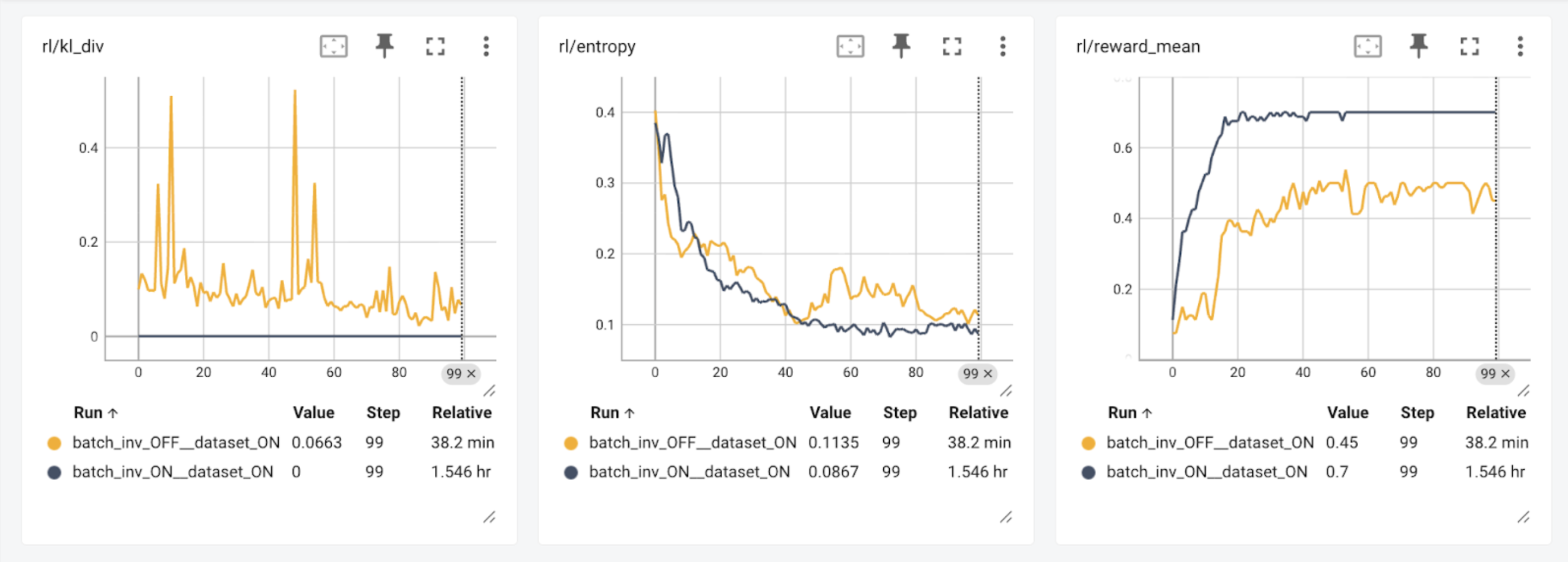 Reinforcement learning has been shown to amplify tiny numerical mismatches between trainer and sampler, leading to non-deterministic and unstable training behavior (He et al. & Yao, Liu et al.). We verified the impact of numerics on RL results with our results: Running the sampler with different kernels than the trainer (batch_inv_OFF) shows a reduced reward over 100 steps. Enabling bitwise exact training (batch_inv_ON, where kl_div always equals to 0.0), we see the model not only train in fewer steps, but reach a higher total reward.