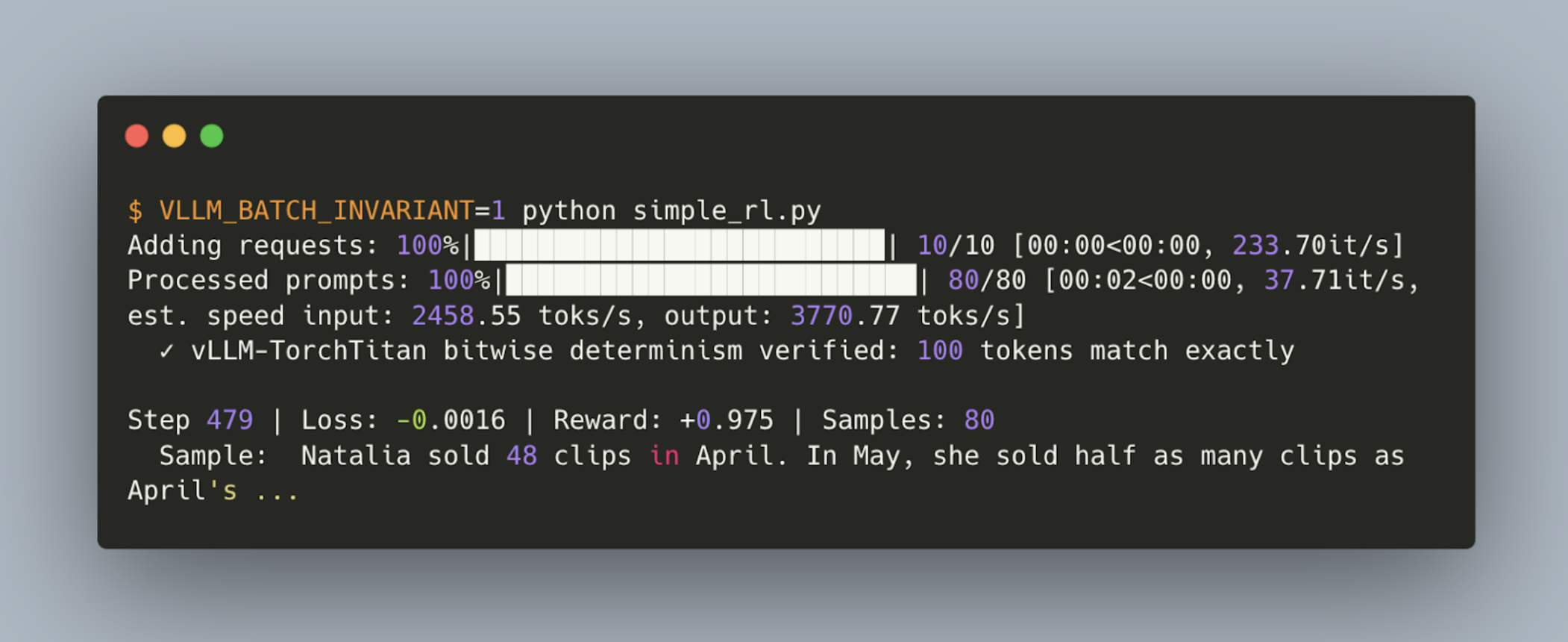 We demonstrate an open-source bitwise consistent on-policy RL run with TorchTitan as the training engine and vLLM as the inference engine. Built on top of vLLM’s recent work on batch-invariant inference, we show how to run an RL fine-tune of Qwen3 1.7B with bitwise matching training and inference numerics in our open-sourced instructions: